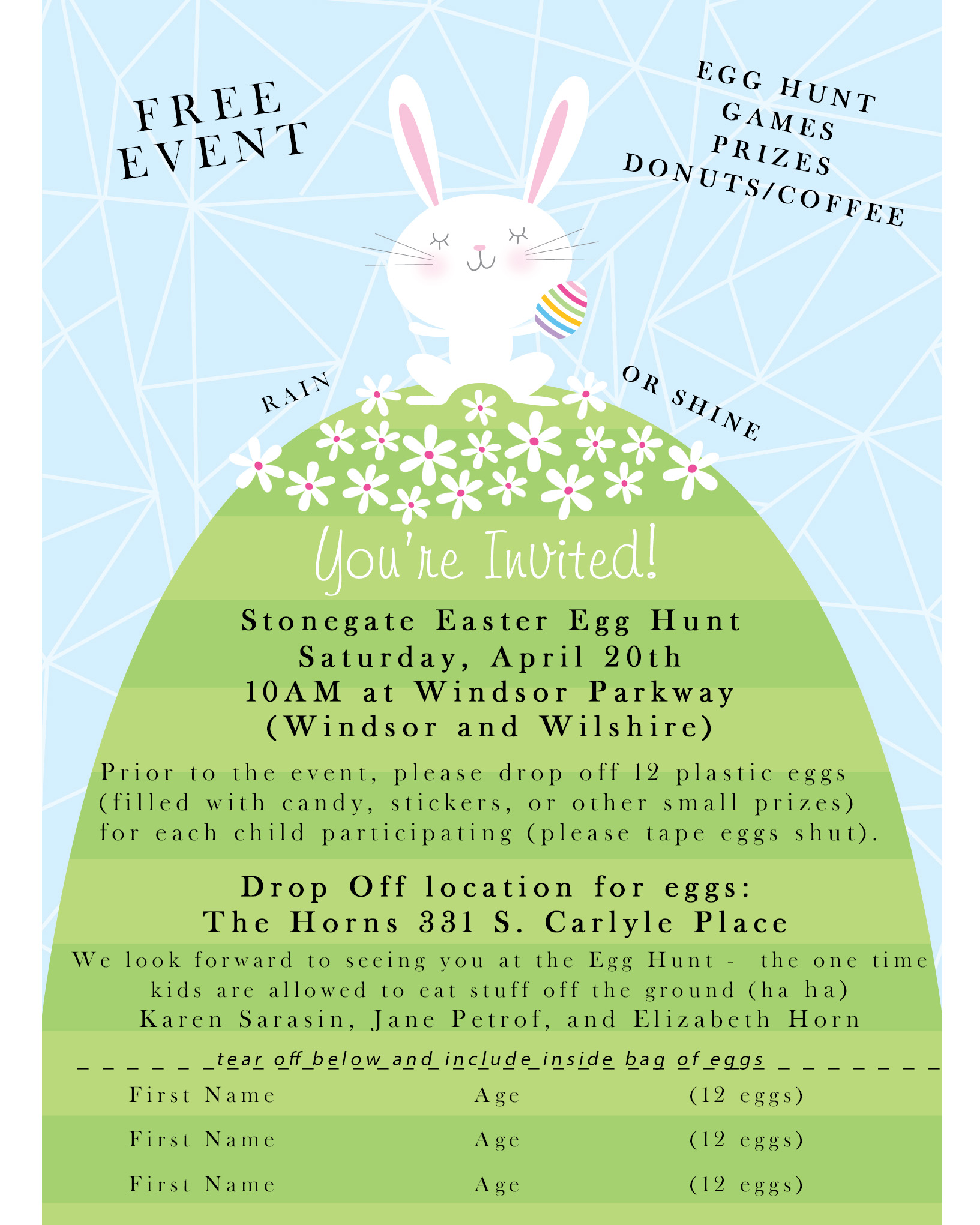 Prior to the event, please drop off 12 plastic eggs (filled with candy, stickers, or other small prizes) for each child participating (please tape eggs shut).