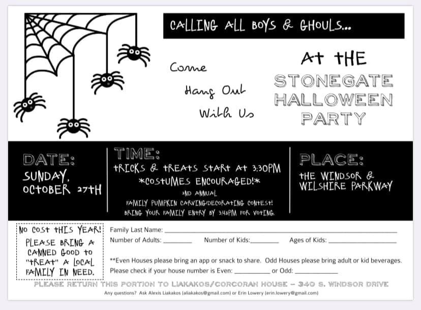The Stonegate Halloween party is coming…your invites are too! No cost this year but please RSVP by returning the paper form or emailing Alexis so we can plan for your little goblins. View the flyer for all the details.
